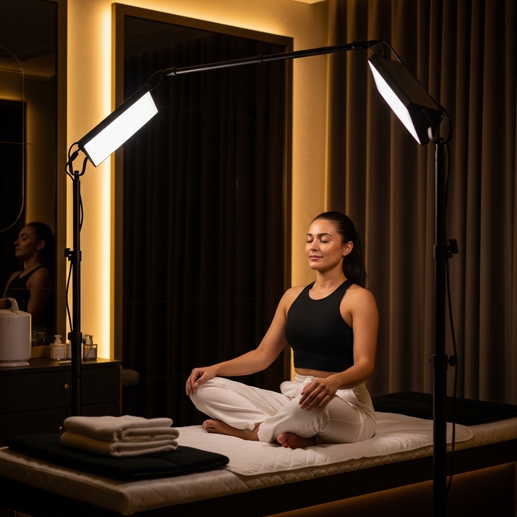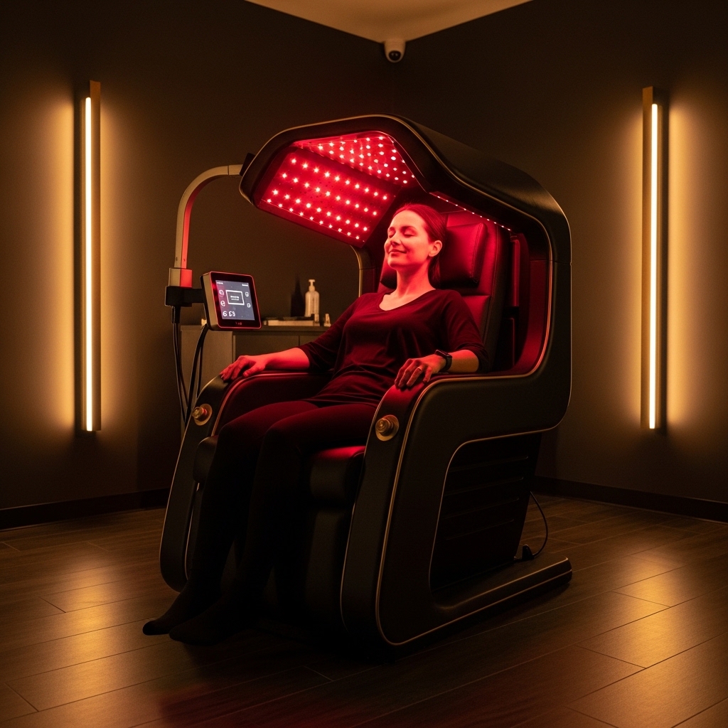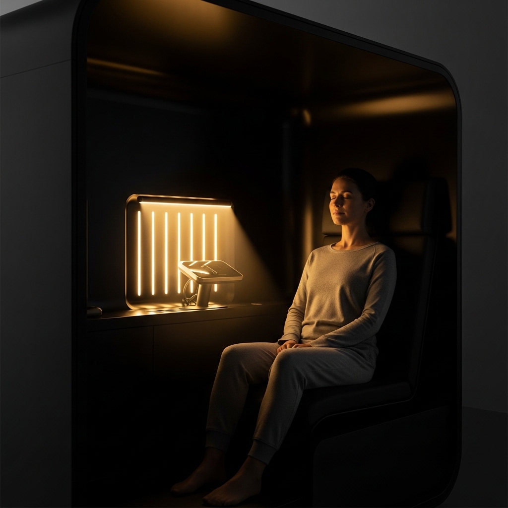 A warm, clean, full-body light experience surrounds you. It feels controlled, comfortable, and restorative.